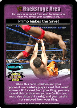 When this card is hidden and your opponent successfully plays a card that would remove a D: 1+ card from your Ring, you may reveal this card (when you are Carlito, you must also discard 4 cards), and your card is not removed from your Ring.