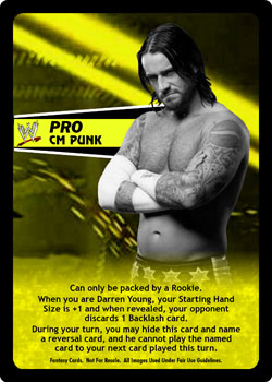 Can only be packed by a Rookie. When you are Darren Young, your Starting Hand Size is +1 and when revealed your opponent discards 1 Backlash card. During your turn, you may hide this card and name a reversal card, and he cannot play the named card to your next card played this turn.