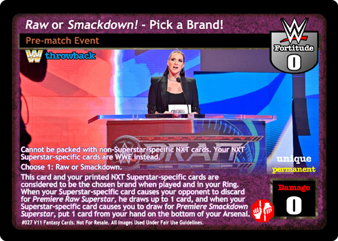 Cannot be packed with non-Superstar-specific NXT cards. Your NXT Superstar-specific cards are WWE instead. Choose 1: Raw or Smackdown.This card and your printed NXT Superstar-specific cards are considered to be the chosen brand when played and in your Ring. When your Superstar-specific card causes your opponent to discard for Premiere Raw Superstar, he draws up to 1 card, and when your Superstar-specific card causes you to draw for Premiere Smackdown Superstar, put 1 card from your hand on the bottom of your Arsenal.