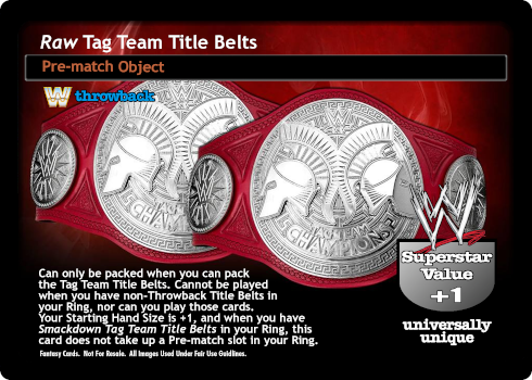 Can only be packed when you can pack the Tag Team Title Belts. ßCannot be played when you have non-Throwback Title Belts in your Ring, nor can you play those cards. ßYour Starting Hand Size is +1, and when you have Smackdown Tag Team Title Belts in your Ring, this card does not take up a Pre-match slot in your Ring. Superstar Value +1