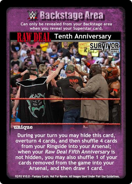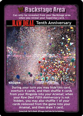 During your turn you may hide this card, overturn 4 cards, and then shuffle 4 cards from your Ringside into your Arsenal; when your Raw Deal Fifth Anniversary is not hidden, you may also shuffle 1 of your cards removed from the game into your Arsenal, and then draw 1 card.