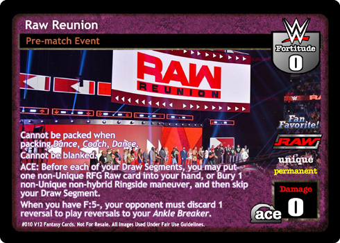 Cannot be packed when packing Dance, Coach, Dance. Cannot be blanked. ACE: Before each of your Draw Segments, you may put one non-Unique RFG Raw card into your hand, or Bury 1 non-Unique non-hybrid Ringside maneuver, and then skip your Draw Segment. When you have F:5-, your opponent must discard 1 reversal to play reversals to your Ankle Breaker.