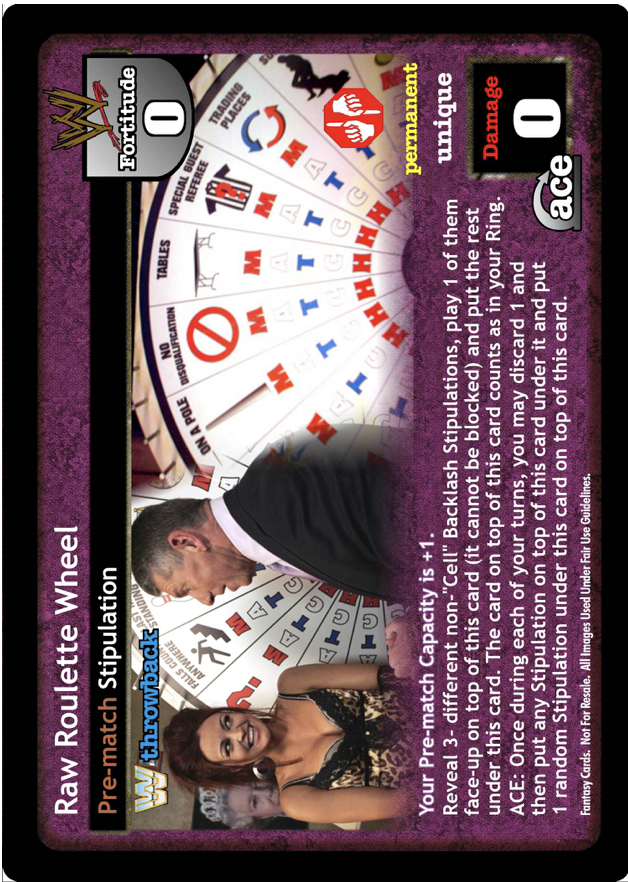 Your Pre-match Capacity is +1. Reveal up to 3 different Stipulations (except Hell in a Cell Match) from your Backlash, immediately play 1 of them face-up on top of this card and put the rest under this card. The card on top of this card is considered to be in your Ring. ACE: Once during each of your turns, you may discard 1 card and then put any Stipulation on top of this card under this card and put 1 random Stipulation from under this card on top of this card.