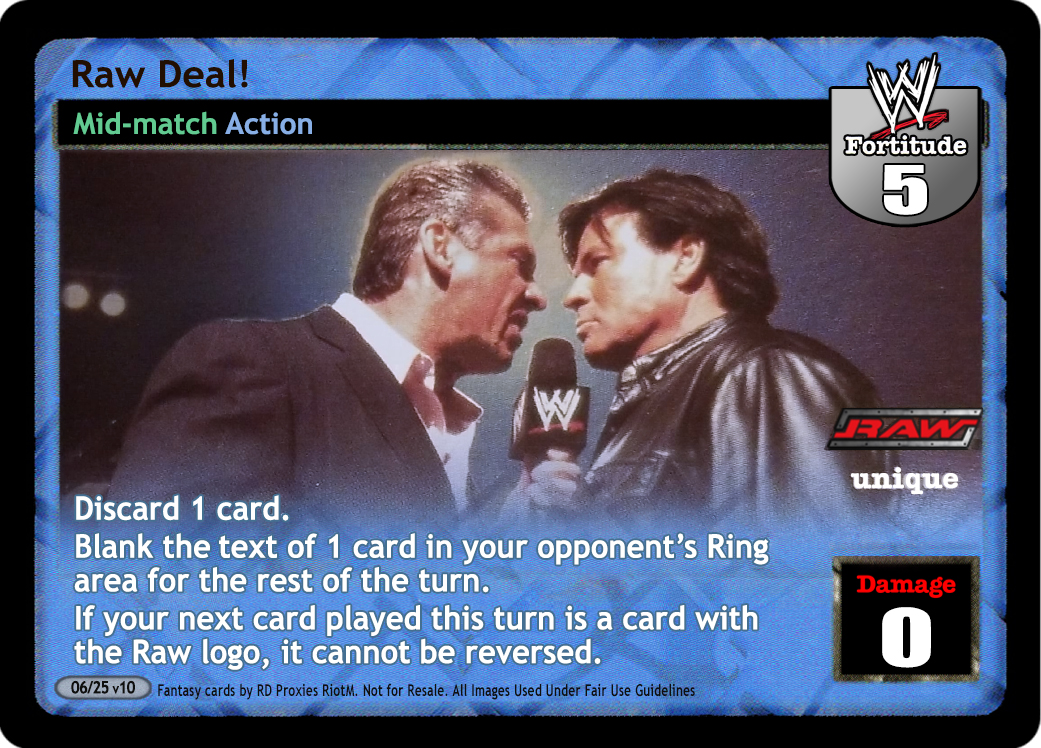 Discard 1 card. Blank the text of 1 card in your opponent's Ring area for the rest of the turn. If your next card played this turn is a card with the Raw logo, it cannot be reversed.