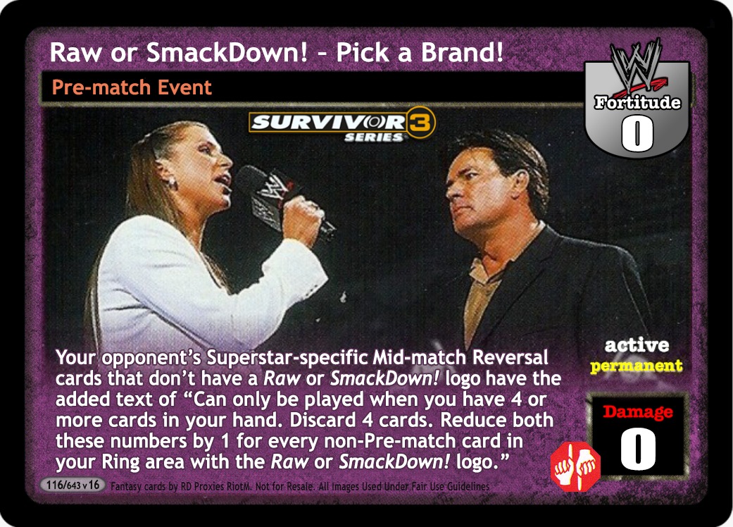Your opponent's Superstar-specific Mid-match Reversal cards that don't have a Raw or SmackDown! logo have the added text of "Can only be played when you have 4 or more cards in your hand. Discard 4 cards. Reduce both these numbers by 1 for every non-Pre-match card in your Ring area with the Raw or SmackDown! logo."