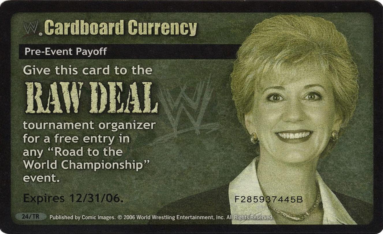 Give this card to the Raw Deal tournament organizer for a free entry in any "Road to the World Championship" event.