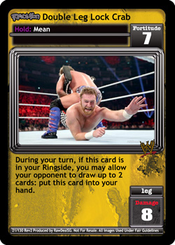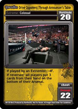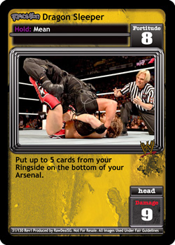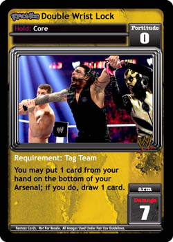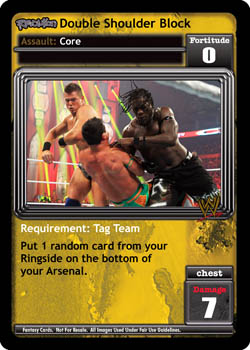Requirement: Tag Team. Put 1 random card from your Ringside on the bottom of your Arsenal.