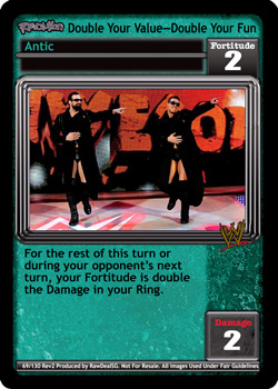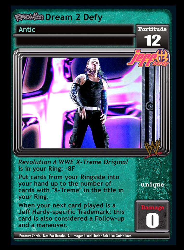 Revolution A WWE X-Treme Original is in your Ring: -8F Put cards from your Ringside into your hand up to the number of cards with 'X-Treme' in the title in your Ring. If your next card played is a Jeff Hardy-specific Trademark: this card is also considered a Follow-up and a maneuver.