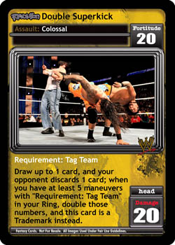 Requirement: Tag Team. Draw up to 1 card, and your opponent discards 1 card; when you have at least 5 maneuvers with 'Requirement: Tag Team' in your Ring, double those numbers, and this card is a Trademark instead.