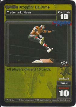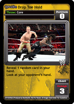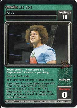 Requirement: 'Revolution The Degenerates' Faction in your Ring. Draw up to 3 cards. Your opponent discards 1 random card. If you have 3 or more Superstar-specifics from 'The Degenerates' Faction Members and/or cards with 'The Degenerates' in the text in your Ring, your opponent discards 4 random cards from his Backlash.
