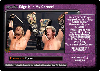 Pack this card: you may pack up to 4 Edge Antics and/or Maneuvers in your Arsenal. If this card is not in your Ring: they gain Requirement: 'Revolution Edge Is In My Corner!' in your Ring. You cannot play Corners. Your Storyline is Permanent.