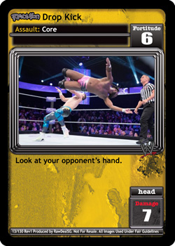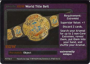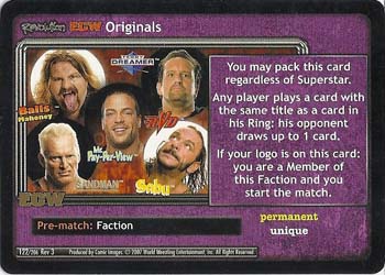 You may pack this card regardless of Superstar. Any player plays a card with the same title as a card in his Ring: his opponent draws up to 1 card. If your logo is on this card: you are a Member of this Faction and you start the match.