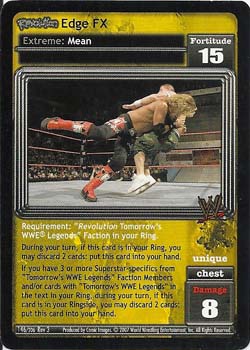 Requirement: 'Revolution Tomorrow's WWE½ Legends' Faction in your Ring. During your turn, if this card is in your Ring, you may discard 2 cards: put this card into your hand. If you have 3 or more Superstar-specifics from 'Tomorrow's WWE Legends' Faction Members and/or cards with 'Tomorrow's WWE Legends' in the text in your Ring, during your turn, if this card is in your Ringside, you may discard 2 cards: put this card into your hand.