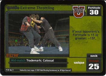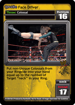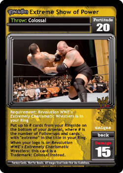 Requirement: Revolution WWE's Extremely Charismatic Wrestlers is in your Ring. Put up to # cards from your Ringside on the bottom of your Arsenal, where # is the number of Follow-ups and cards with 'extreme' in the title in your Ring. When your logo is on Revolution WWE's Extremely Charismatic Wrestlers: this card is a Trademark: Colossal instead.