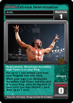 Requirement: Revolution Incredible High Flyers is in your Ring. Put up to 1 non-Unique card from your Ringside into your hand. When your logo is on Revolution Incredible High Flyers and this card is in your Ring, once during each of your turns you may discard 1 card: draw up to 1 card.