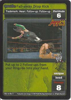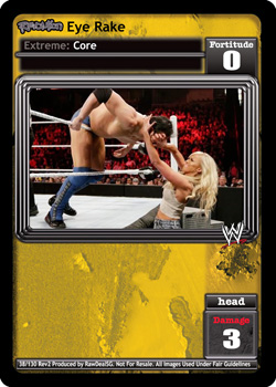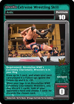 Requirement: Revolution WWE's Extremely Charismatic Wrestlers is in your Ring. Draw up to 1 card, and when your next card played is an Extrene: Follow-up: ignore the Follow-up and it is +3D. When your logo is on Revolution WWE's Extremely Charismatic Wrestlers, you may discard 2 cards: look at your opponent's hand and choose 1 card: he discards the chosen card.