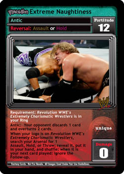 Requirement: Revolution WWE's Extremely Charismatic Wrestlers is in your Ring. Antic: Your opponent discards 1 card and overturns 2 cards. When your logo is on Revolution WWE's Extremely Charismatic Wrestlers, search your Arsenal for 1 Extreme: Follow-Up, Assault, or Hold; reveal it, put it in your hand, and shuffle; when it is your next card played: ignore the Follow-up.