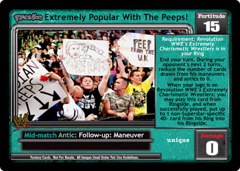 Requirement: Revolution WWE's Extremely Charismatic Wrestlers is in your Ring. End your turn. During your opponent's next 2 turns, reduce the number of cards drawn from his maneuvers and antics to 0. When your logo is on Revolution WWE's Extremely Charismatic Wrestlers: you may play this card from Ringside, and when successfully played, put up to 1 non-Superstar-specific 4D- card from his Ring to his Ringside.