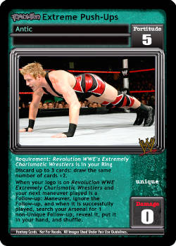 Requirement: Revolution WWE's Extremely Charismatic Wrestlers is in your Ring. Discard up to 3 cards: draw the same number of cards +2. When your logo is on Revolution WWE Extremely Charismatic Wrestlers and your next maneuver is an Extreme: Follow-up: Maneuver, ignore the Follow-up, and when it is successfully played, search your Arsenal for 1 Extreme: Follow-up, reveal it, put it in your hand, and shuffle.