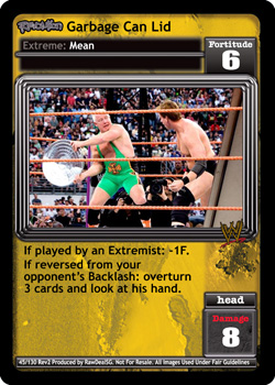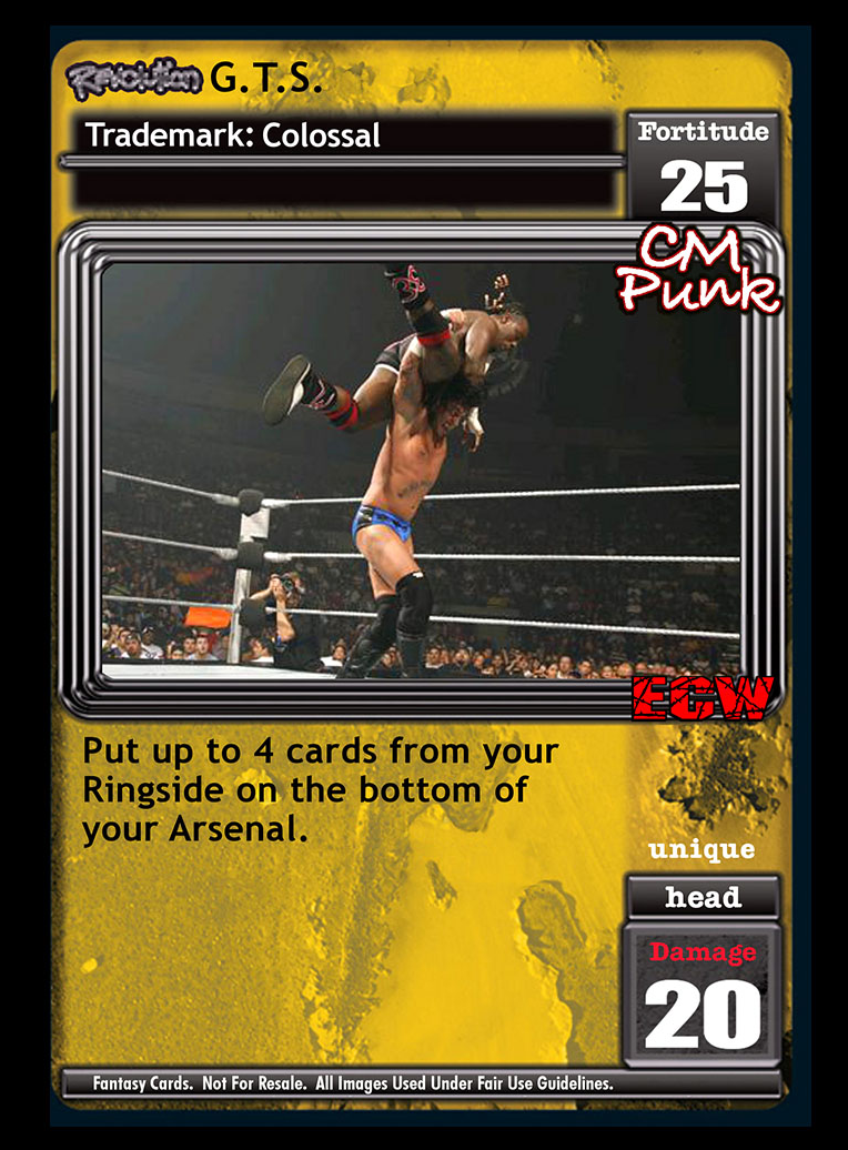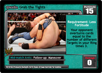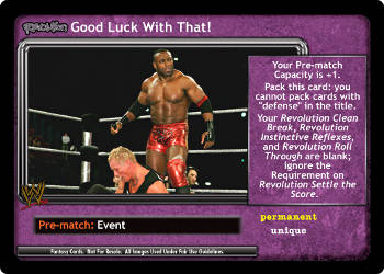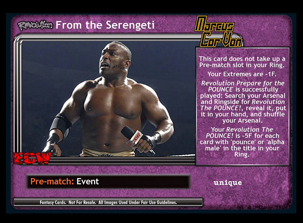 This card does not take up a Pre-match slot in your Ring. Your Extremes are -1F. Revolution Prepare for the POUNCE is successfully played: Search your Arsenal and Ringside for Revolution The POUNCE!, reveal it, put it in your hand, and shuffle your Arsenal. Your Revolution The POUNCE! is -5F for each card with 'pounce' or 'alpha male' in the title in your Ring.