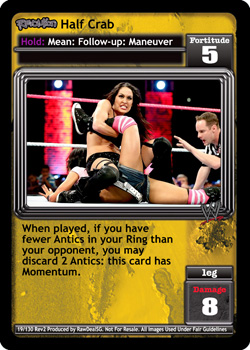 When played, if you have fewer Antics in your Ring than your opponent, you may discard 2 Antics: this card has Momentum.