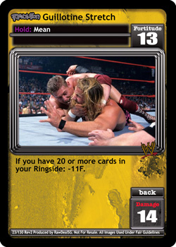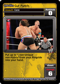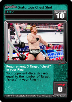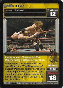 Requirement: 'Revolution The Degenerates' Faction in your Ring. If you have 3 or more Superstar-specifics from 'The Degenerates' Faction Members and/or cards with 'The Degenerates' in the text in your Ring, look at your opponent's hand, choose up to 1 Unique, and he discards it.