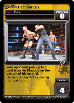 Your opponent puts up to 1 card from his Ringside on the bottom of his Arsenal. He cannot play Antics during his next turn.