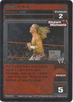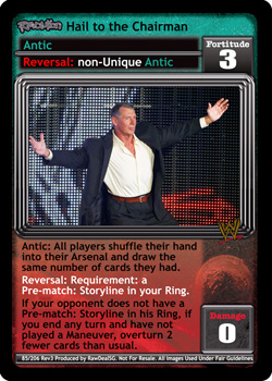 Antic: All players shuffle their hand into their Arsenal and draw the same number of cards they had. Reversal: Requirement: a Pre-match: Storyline in your Ring. If your opponent does not have a Pre-match: Storyline in his Ring, if you end any turn and have not played a Maneuver, overturn 2 fewer cards than usual.