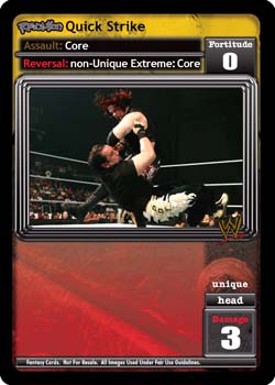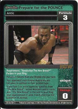Requirement: 'Revolution The New Breed' Faction in your Ring. Put up to 1 Extreme from your Ringside into your hand. Your opponent's non-Unique Maneuvers are Extremes in addition to their printed type. If you have 3 or more Superstar-specifics from 'The New Breed' Faction Members and/or cards with 'The New Breed' in the text in your Ring, your opponent puts 3 cards from his hand on the bottom of his Arsenal.