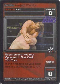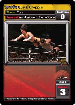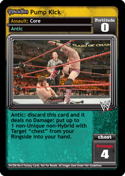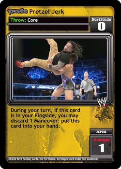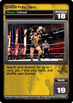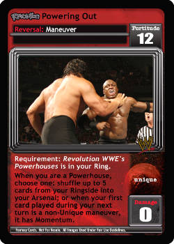 Requirement: Revolution WWE's Powerhouses is in your Ring. When you are a Powerhouse, choose one: shuffle up to 5 cards from your Ringside into your Arsenal; or when your first card played during your next turn is a non-Unique maneuver, it has Momentum.