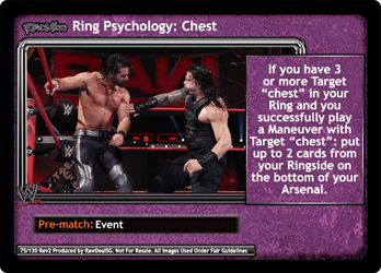 If you have 3 or more Target 'chest' in your Ring and you successfully play a Maneuver with Target 'chest': put up to 2 cards from your Ringside on the bottom of your Arsenal.