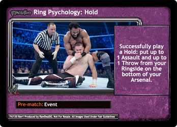 Successfully play a Hold: put up to 1 Assault and up to 1 Throw from your Ringside on the bottom of your Arsenal