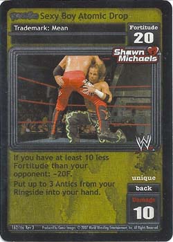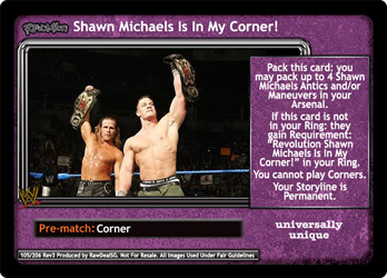 Pack this card: you may pack up to 4 Shawn Michaels Antics and/or Maneuvers in your Arsenal. If this card is not in your Ring: they gain Requirement: 'Revolution Shawn Michaels Is In My Corner!' in your Ring. You cannot play Corners. Your Storyline is Permanent.