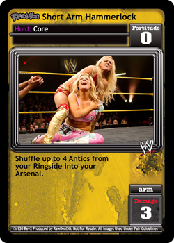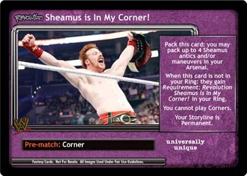 Pack this card: you may pack up to 4 Sheamus antics and/or maneuvers in your Arsenal. When this card is not in your Ring: they gain Requirement: Revolution Sheamus Is In My Corner! in your Ring. You cannot play Corners. Your Storyline is Permanent.