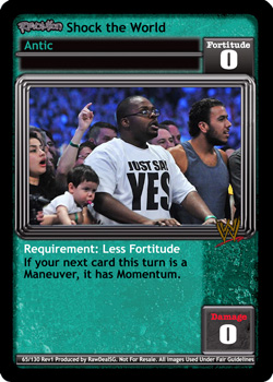 If you have at least 10 less Fortitude than your opponent: -20F. Put up to 3 Antics from your Ringside into your hand.