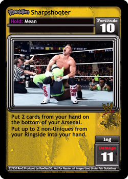 Put 2 cards from your hand on the bottom of your Arsenal. Put up to 2 non-Uniques from your Ringside into your hand