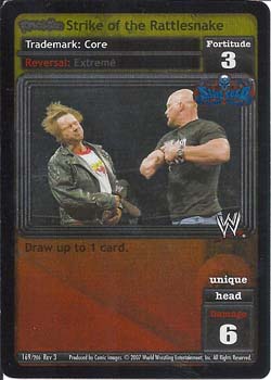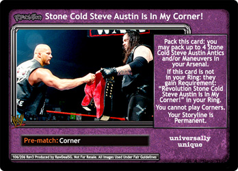 Pack this card: you may pack up to 4 Stone Cold Steve Austin Antics and/or Maneuvers in your Arsenal. If this card is not in your Ring: they gain Requirement: 'Revolution Stone Cold Steve Austin Is In My Corner!' in your Ring. You cannot play Corners. Your Storyline is Permanent.