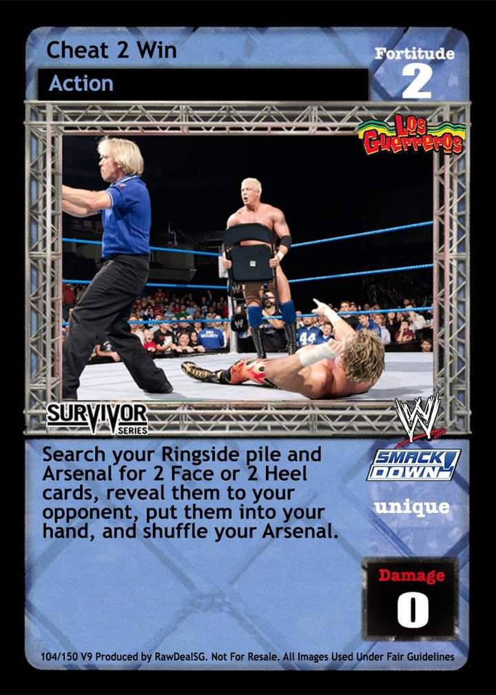 Search your Ringside pile and Arsenal for 2 Face or 2 Heel cards, reveal them to your opponent, put them into your hand, and shuffle your Arsenal.