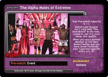 Your Pre-match Capacity is +1. Search your Arsenal for 1 card with 'The New Breed' in the text, reveal it, put it in your hand, and shuffle. When you are a printed Member of The New Breed Faction and you have lower Fortitude: your Superstar-specific Antics are -5F.