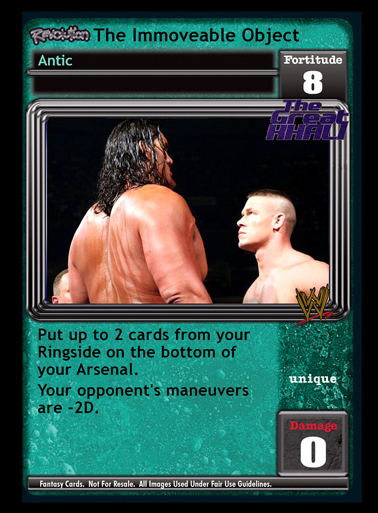 Pack this card: you may pack up to 4 The Great Khali Antics and/or Maneuvers in your Arsenal. If this card is not in your Ring: they gain Requirement: 'Revolution The Great Khali Is In My Corner!' in your Ring. You cannot play Corners. Your Storyline is Permanent.