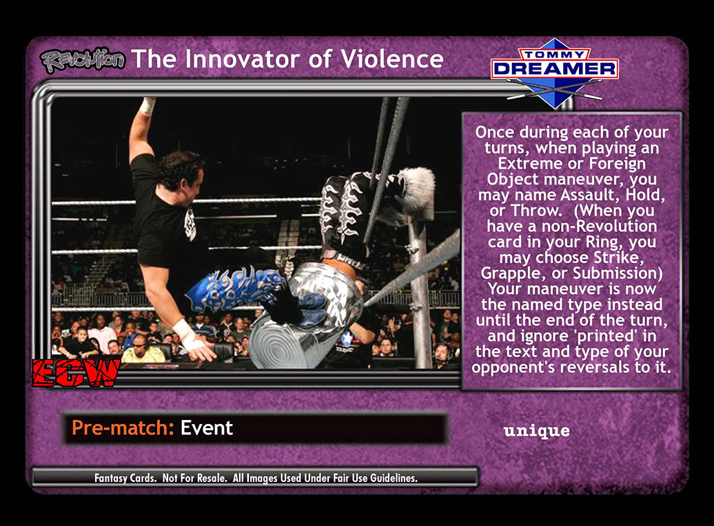 Once during each of your turns, when playing an Extreme or Foreign Object maneuver, you may name Assault, Hold, or Throw. (When you have a non-Revolution card in your Ring, you may choose Strike, Grapple, or Submission) Your maneuver is now the named type instead until the end of the turn, and ignore 'printed' in the text and type of your opponent's reversals to it.