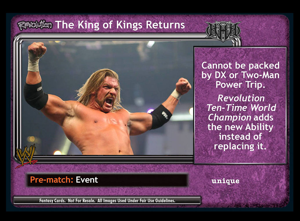 Cannot be packed by DX or Two-Man Power Trip. Revolution Ten-Time World Champion adds the new Ability instead of replacing the printed Ability.