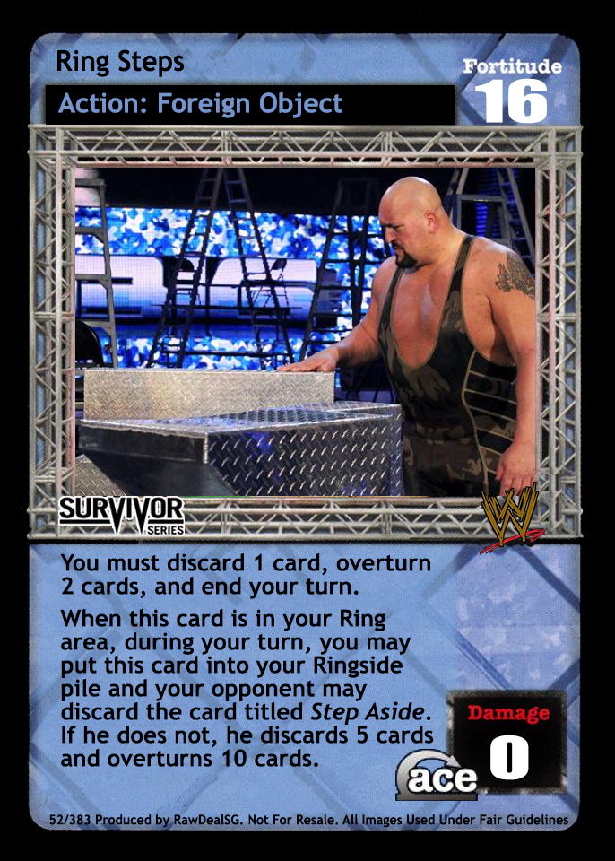 You must discard 1 card, overturn 2 cards, and end your turn. When this card is in your Ring area, during your turn, you may put this card into your Ringside pile and your opponent may discard the card titled Step Aside. If he does not, he discards 5 cards and overturns 10 cards.