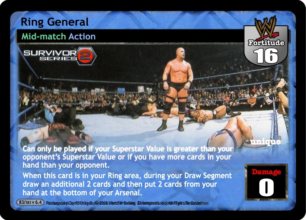 Can only be played if your Superstar Value is greater than your opponent's Superstar Value or if you have more cards in your hand than your opponent. When this card is in your Ring area, during your Draw Segment draw an additional 2 cards and then put 2 cards from your hand at the bottom of your Arsenal.