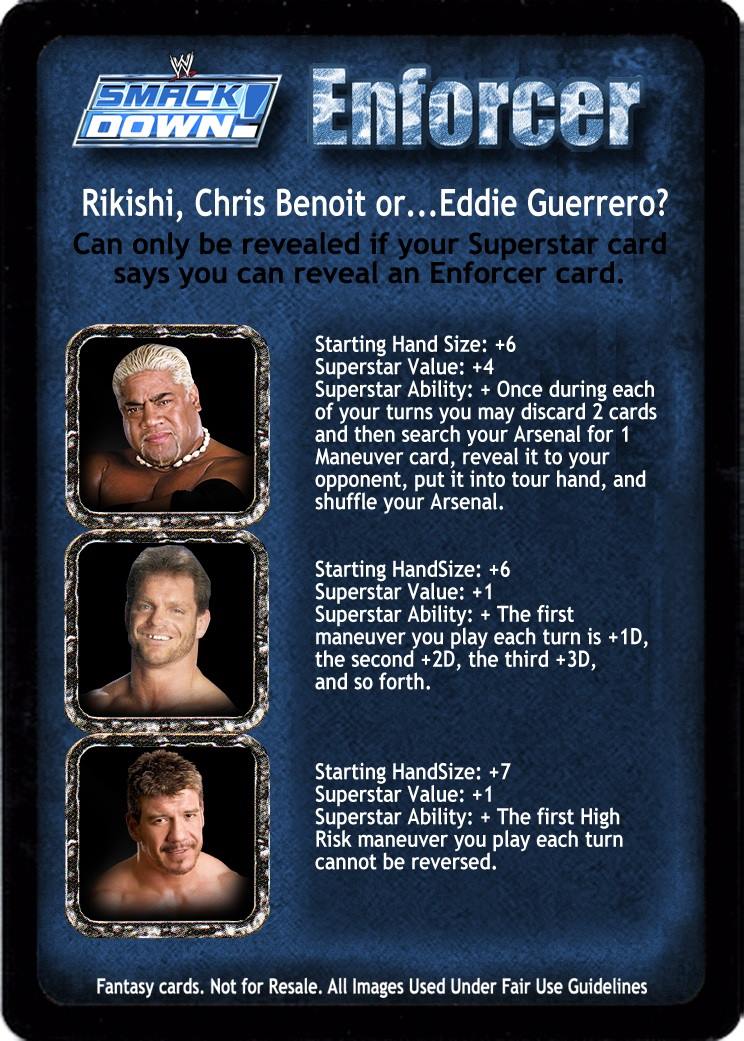 Can only be revealed if your Superstar card says you can reveal an Enforcer card. - Starting Hand Size: +6 Superstar Value: +4 Superstar Ability: +Once during each of your turns you may discard 2 cards and then search your Arsenal for 1 Maneuver card, reveal it to your opponent, put it into your hand, and shuffle your Arsenal. - Starting Hand Size: +6 Superstar Value: +1 Superstar Ability: +The first maneuver you play each turn is +1D, the second +2D, the third +3D, and so forth. - Starting Hand Size: +7 Superstar Value: +1 Superstar Ability: +The first High Risk maneuver you play each turn cannot be reversed.