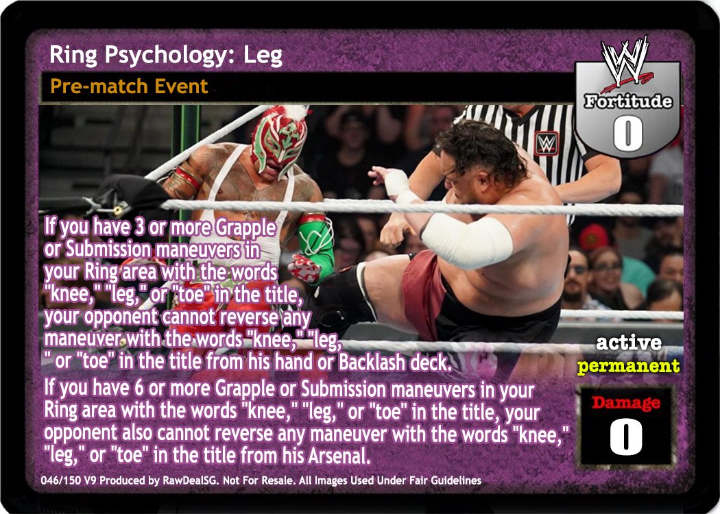 If you have 3 or more Grapple or Submission maneuvers in your Ring area with the words "knee," "leg," or "toe" in the title, your opponent cannot reverse any maneuver with the words "knee," "leg," or "toe" in the title from his hand or Backlash deck. If you have 6 or more Grapple or Submission maneuvers in your Ring area with the words "knee," "leg," or "toe" in the title, your opponent also cannot reverse any maneuver with the words "knee," "leg," or "toe" in the title from his Arsenal.