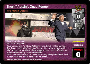 Cannot be blanked. You start the game. Your opponent's Fortitude Rating is considered -10 for playing Run-ins or cards with 'interfere' in the title. Your actions with 'GM' in the text (without 'draw segment' text) are -10F and can only be reversed by Unique reversals. Discard and overturn 1 less card for Can of Beer; when that card is Activated, the effect cannot be reversed.