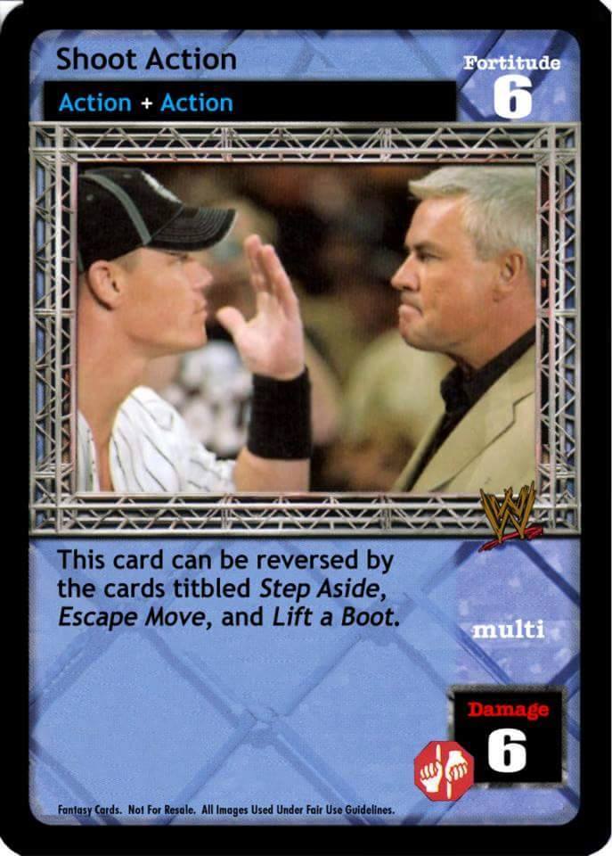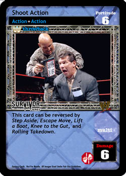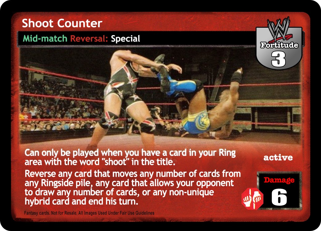 Can only be played when you have a card in your Ring area with the word "shoot" in the title. Reverse any card that moves any number of cards from any Ringside pile, any card that allows your opponent to draw any number of cards, or any non-unique hybrid card and end his turn.