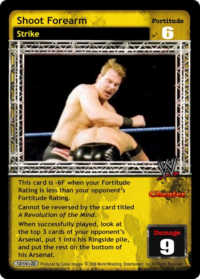 This card is -6F when your Fortitude Rating is less than your opponent's Fortitude Rating. Cannot be reversed by the card titled A Revolution of the Mind. When successfully played, look at the top 3 cards of your opponent's Arsenal, put 1 into his Ringside pile, and put the rest on the bottom of his Arsenal.