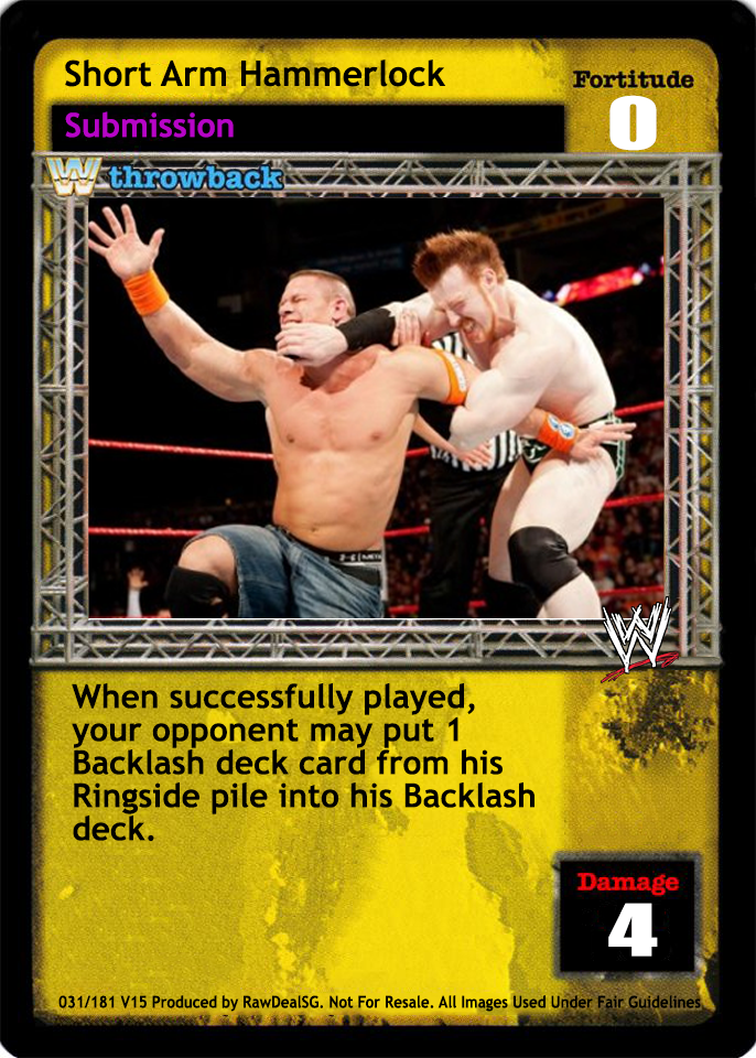 When successfully played, your opponent may put 1 Backlash deck card from his Ringside pile into his Backlash deck.